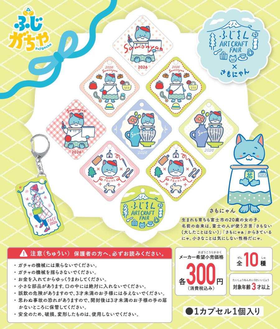 シティプロモーション大使さもにゃんがデザインされた「ふじがちゃ」の商品を通じて、富士市の魅力を知るとともに、商品をカバンなどに取り付けて、意図せずに富士市を発信するといった、みんなでシティプロモーションを進める仕掛けの一つとして実施しています。