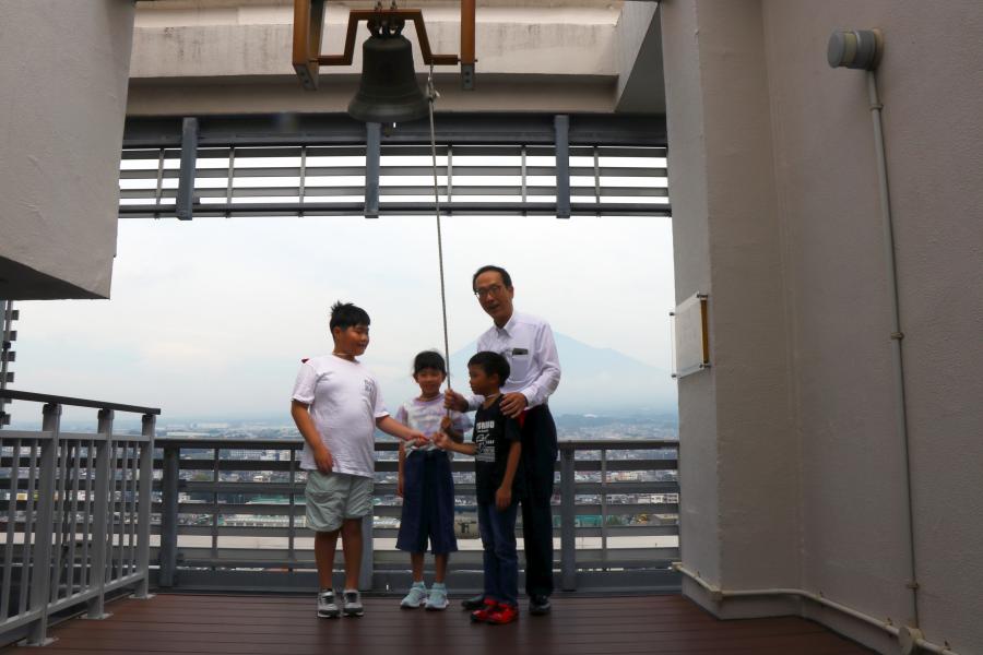 小長井富士市長と代表児童が、一緒に鐘を鳴らしました。