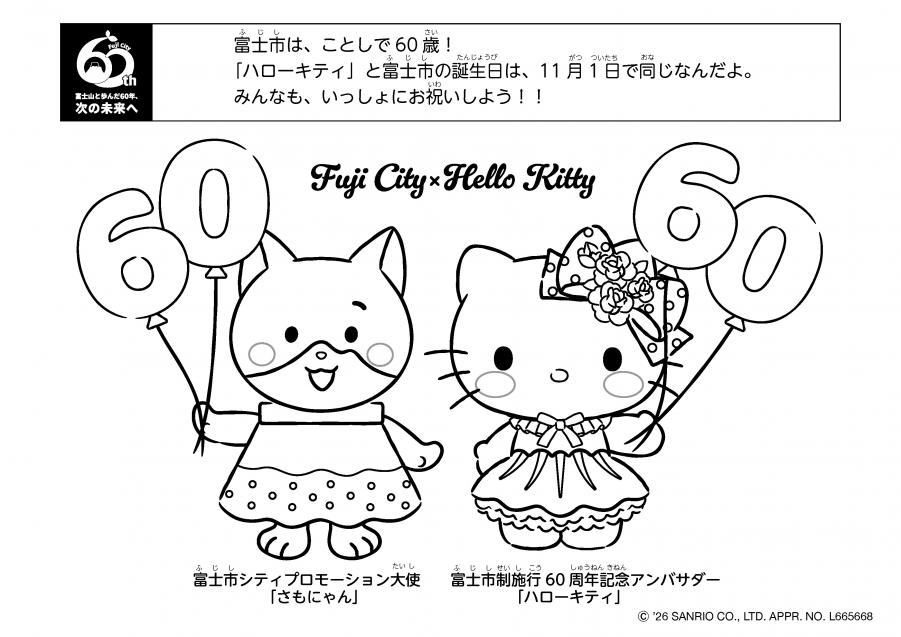 オール富士市で富士市制施行60周年を盛り上げるべく、富士市オリジナルデザインの「ハローキティ」と、富士市シティプロモーション大使「さもにゃん」のぬりえを製作しました。