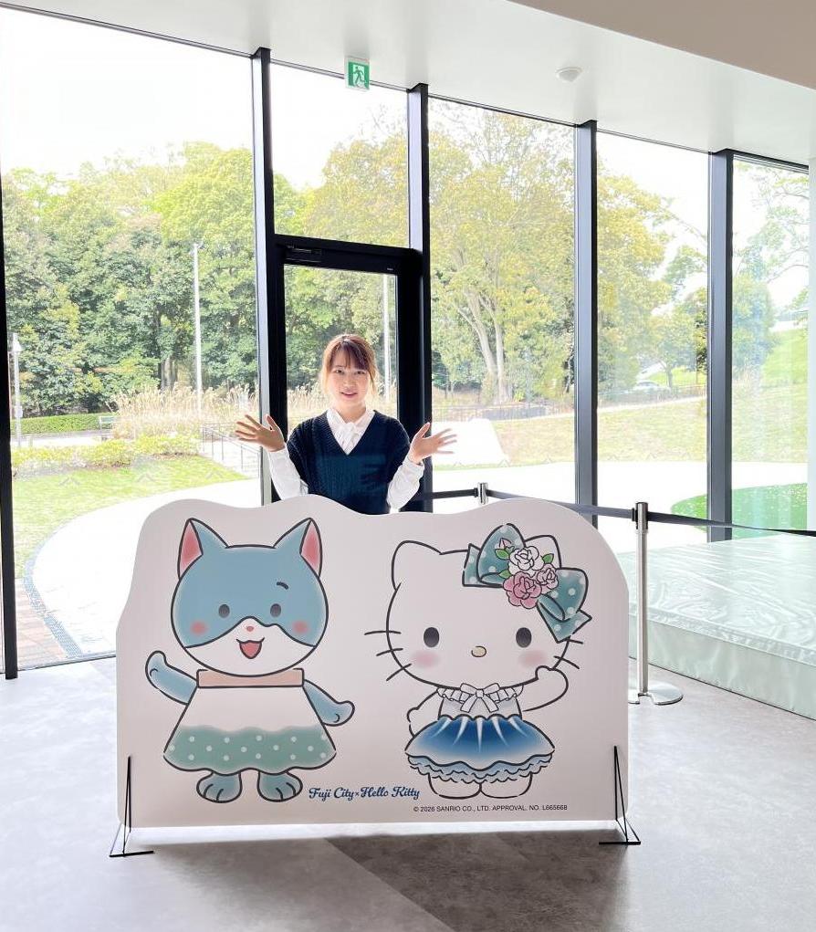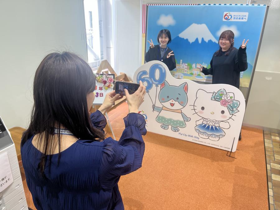 富士市制施行60周年記念アンバサダー「ハローキティ」×富士市シティプロモーション大使「さもにゃん」のフォトパネルを設置します。