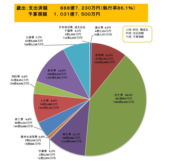 | 土木費 | 8.4% | 74億3,680万円 | 101億5,231万円 |