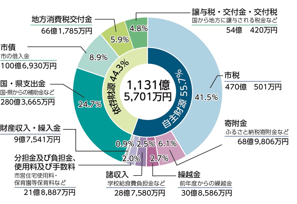 令和6年度の一般会計の歳入の総額は1,131億5,701万円です。歳入の約4割は、市民・企業の皆さんに納めていただいた市税です。令和6年度の市税の決算額は約470億円で、前年度と比較して約8億円の減収となりました。これは、多くの企業で業績が好調だったことにより法人市民税が増となった一方、定額減税による個人市民税の減がそれを上回ったことが主な要因として挙げられます。