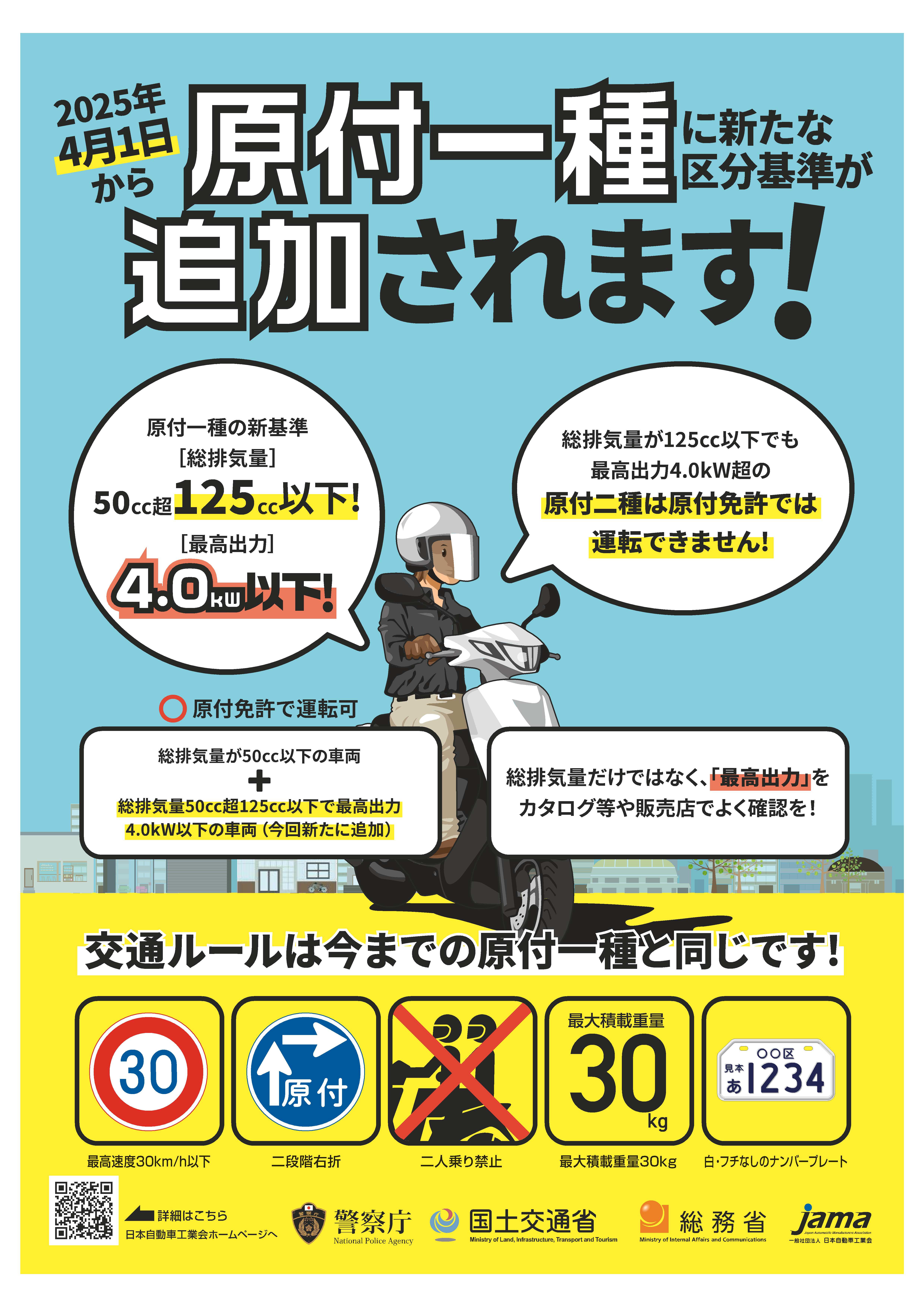 令和7年4月1日から、原付一種に新たな車両区分として、「新基準原動機付自転車」が追加されました。総排気量が125cc以下で、かつ最高出力を4.0kW以下に制御した原動機付自転車のことで、従来の原付(総排気量50cc以下または定格出力0.6kW以下)と同様に、原付免許で運転できます。