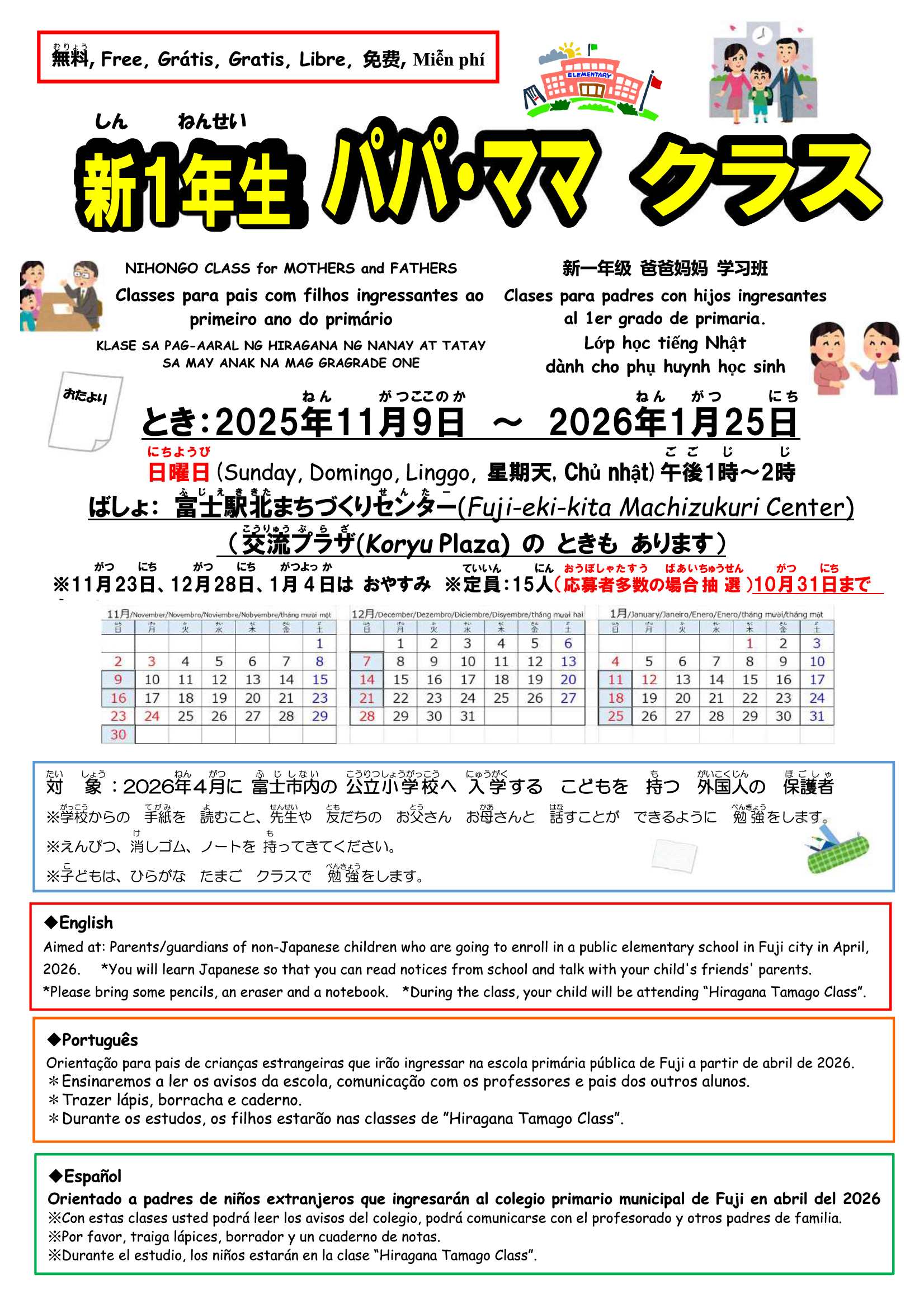 2026年4月に小学校に入学する、外国籍の子どもの保護者(お父さん・お母さん)のための日本語教室をはじめます。