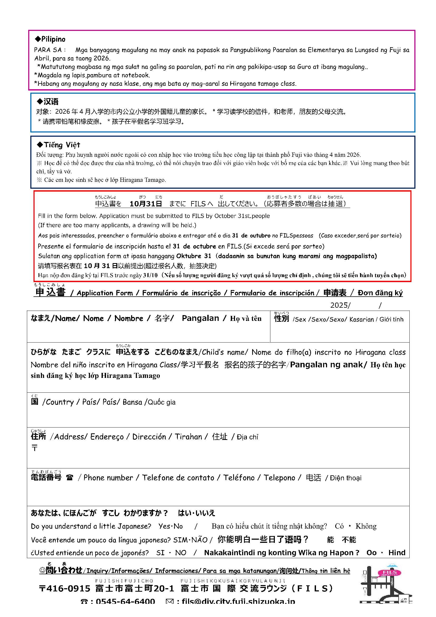 申込 | 勉強をしたい人は、10月31日までに、国際交流ラウンジFILSで、申し込んでください。 国際交流ラウンジFILS(富士市富士町20-1・富士市交流プラザ内) |