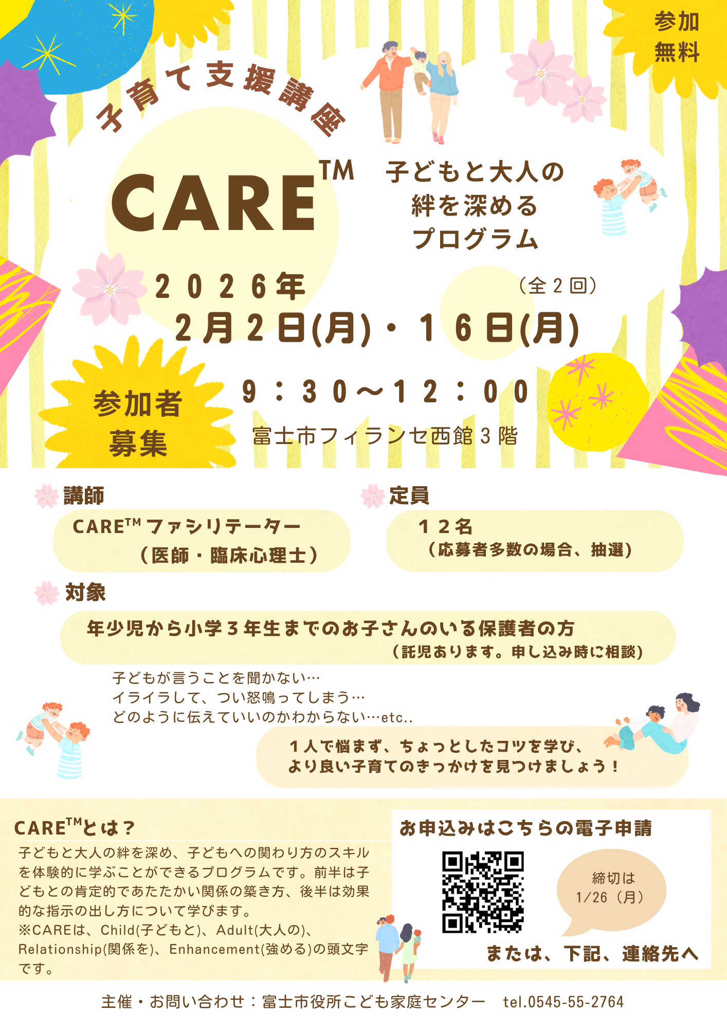 【富士市子育て支援講座】CARE(TM)子どもと大人の絆を深めるプログラム参加者募集