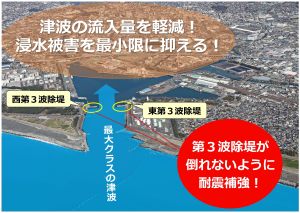 最大クラスの津波「レベル2津波」が襲来するとその威力で倒壊すると仮定されている第3波除堤を強化することによって、港に入ってくる津波の流入量を軽減させ、被害を最小限に抑えます。