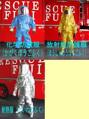 放射能(ほうしゃのう)や、有害(ゆうがい)な化学物質(かがくぶっしつ)が漏(も)れている災害現場(さいがいげんば)で、隊員(たいいん)の身(み)を守(まも)るために着(き)る服(ふく)です。