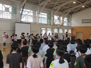 4年生の筝曲を聞く会がありました。富士見中学高等学校の生徒の皆さんが琴の演奏を披露したり、弾き方を教えてくださったりしました。子どもたちは初めて触る琴に緊張しながらも楽しんで体験していました。富士見中学高等学校の皆様貴重な体験をありがとうございました。