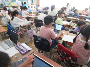6年生の国語科では「きつねの窓」の物語文の読み取りを行い始めました。課題に向けて自分のペースで学びを進める自由進度学習に挑戦です。6年生国語科担当の先生によってパソコン室が「きつねの窓」の物語のように飾り付けられていました。子どもたちは「きつねの窓」の世界に入りながら自分の学習を深めていました。本校は高学年を中心に教科担任制を行っています。6年生は全クラスこの世界に入りながら学習を進めていきます。5年生の体育科では久しぶりに朝だけ熱中症指数が下がり、外での活動ができる状態になったため、ハードル走を行っていました。姿勢や歩数に気を付けてリズムよく飛び越えていました。4年生の図画工作科では自分が作った「学校もりあげマスコット」の発表を行いました。マスコットが出現してほしい場所でマスコットの写真を撮影したものをタブレットを用いながらクラスの友達にマスコットの特徴とともに紹介していました。作ったマスコットはしばらくの間、学校中に展示する予定です。