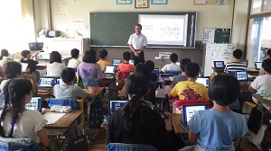 午前中に、前期の終業式が行われました。各学年の代表児童が、前期に頑張ったことなどの話をしました。その内容は、ひらがなの練習、ダンス、あいさつ運動、学級委員、委員会活動、話し合い、国語の枕草子など、様々でした。学級や学年の目標と関連づけて話をする上級生もいました。校長先生からは、前期に笑顔があふれた活動の様子や、後期に向けての話がありました。