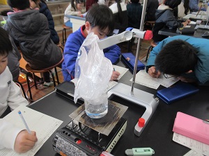 3年生の図画工作科では自然のものを使って自分が思い描く「すみか」を制作しました。落ち葉や枯葉などを拾い、友達と協力して取り組んでいました。できた住処はタブレットで保存しました。また、情報の学習を行いました。学習でも活用するイラストや写真などの扱い方について学び、「著作権」について学習を深めていました。4年生の理科では水を温めると温度や状態がどのように変化するのか、実験を交えながら学習をしました。