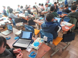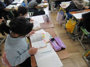 4年生は体育館で6年生を送る会の合唱練習を行っていました。3クラス合同で行い、他のクラスの様子を見合いました。3年生はプレゼンの練習をしていました。パワーポイントの様々な機能を学び、上手に活用しながら発表を行っていました。5年生はプラスチックのたくさんある便利な生活とない生活について比較しながら様々な要因について自分の考えを深めていました。