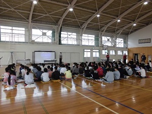 富士市役所防災危機管理課から講師をお招きして、防災に関する学習がスタートしました。阪神淡路大震災や東日本大震災について話をしていただき、被害を最小限にするための普段の備えや揺れに対する対策について学びました。