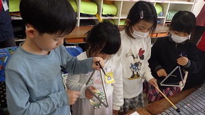 どんぐりに穴をあける道具を上手に使って、こまを作りました。また、どんぐりや松ぼっくりを使って冠や迷路を工夫して作っていました。