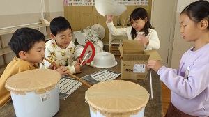 2年生の音楽では、繰り返しを入れた8拍のリズムをつくり、どのようにリズムをつなげればよいのかを考えました。