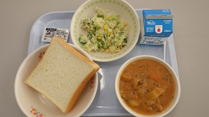 読書旬間とのコラボ給食として、「小さなスプーンおばさん」より、スプーンおばさんのマカロニスープが出ました。子どもたちは、アルファベットや数字の形のマカロニを探しながら楽しそうに食べていました。