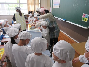 2年生以上は今日から給食が始まりました。新しい仲間と協力して手際よく配膳していました。