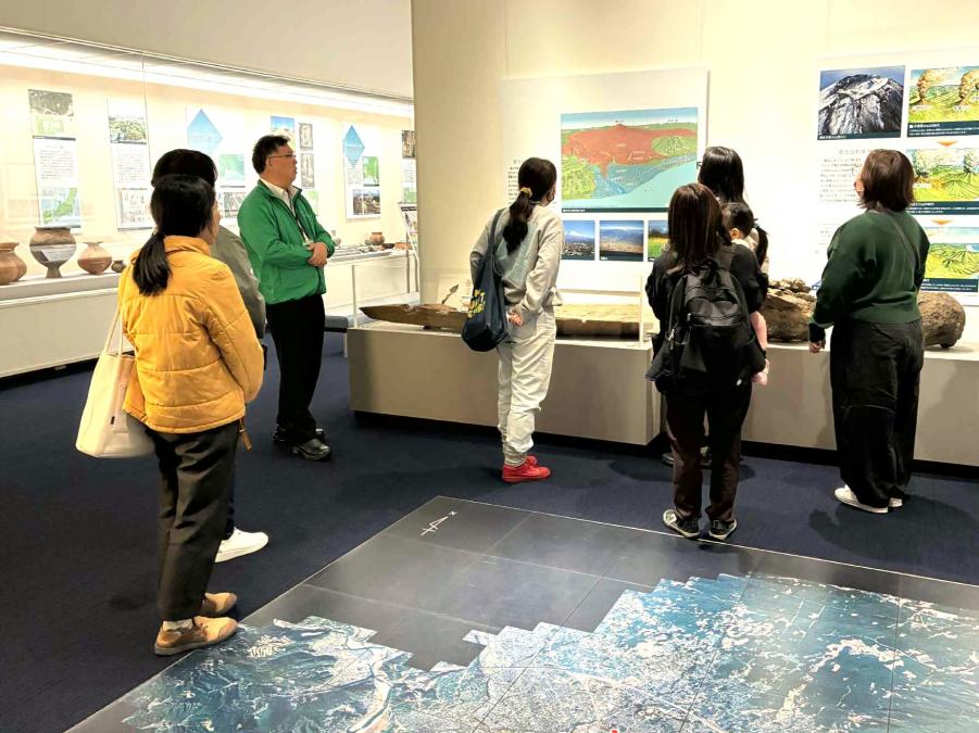 館長の石川さん(右から4人目)の説明を聞きながら館内の展示品を見て回りました。