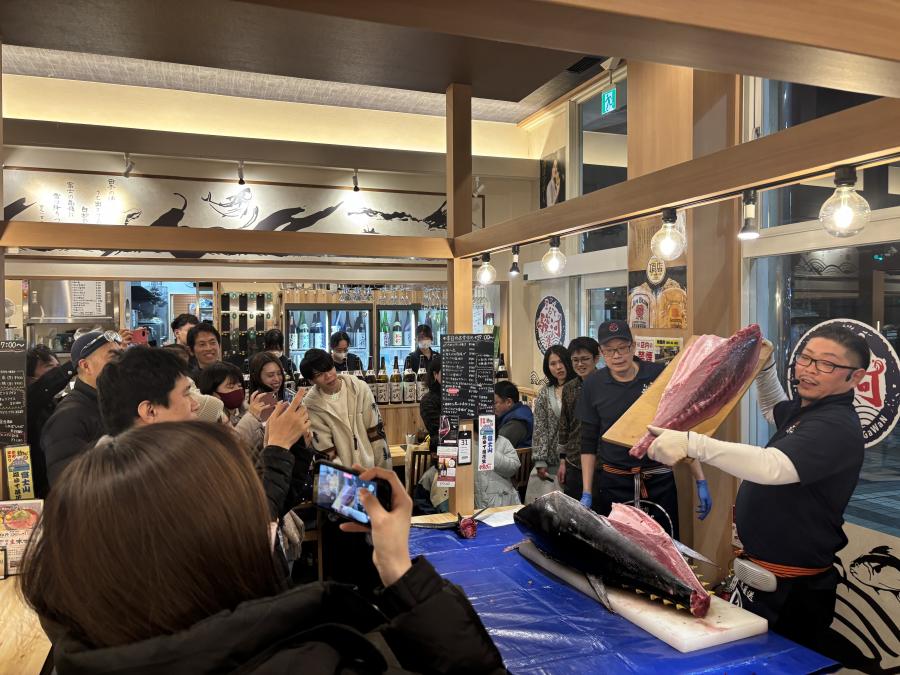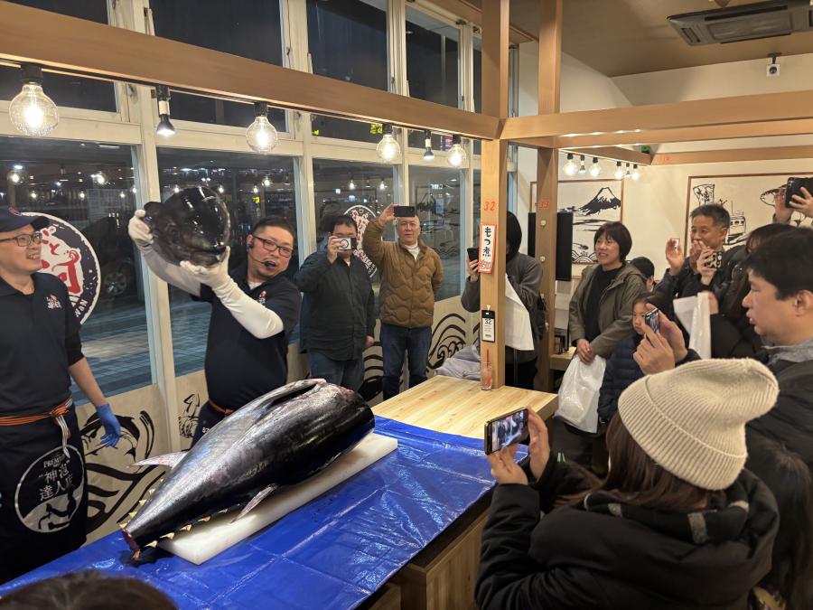 夕食会場の「まるごと駿河湾」では、まぐろの解体ショーも行われ、「ヨイショー!」の掛け声もにぎやかに楽しいひと時を過ごしました。