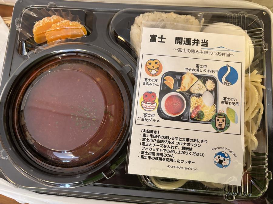 田子の浦で獲れた「しらす」のおにぎりや、富士市と言ったらすっかりおなじみの名物「つけナポリタン」、青島みかんや茶葉のクッキーも入っていました。